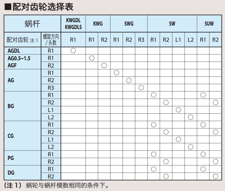 [注] AGF、AG 蝸輪的輪轂材料是FC200。AG 蝸輪主要是與SWG 蝸桿配套。但是,模數1.5 以下時,也可與KWG 蝸桿互換使用。